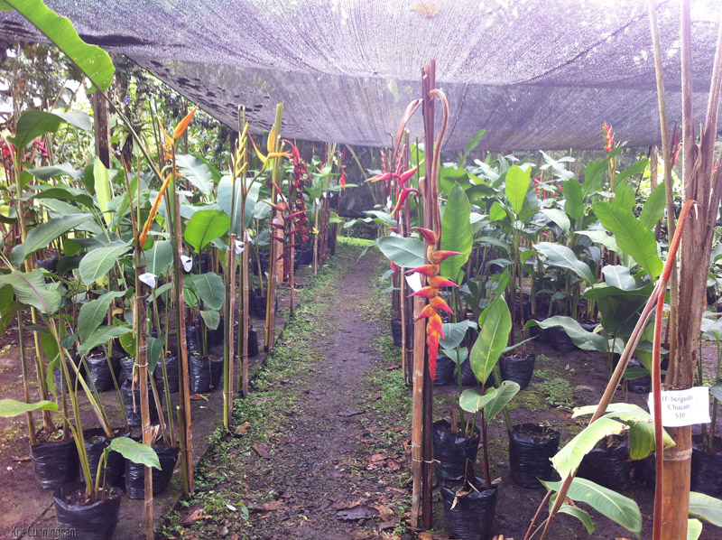 The heliconia sale area. There was a flower on each stick, and the corresponding plants were behind the sticks so it was easy to identify the various types for sale.