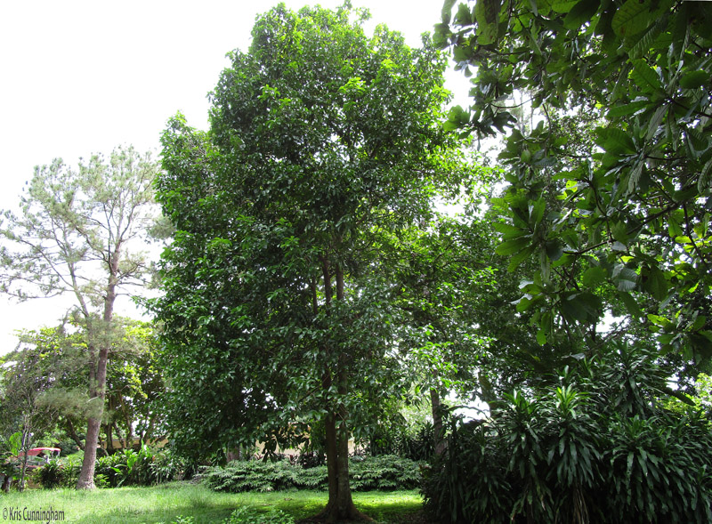 This is a mariñon corizon tree. It has beautiful purple delicate flowers that carpet the ground below in purple petals, and then it makes a somewhat bland fruit that when cooked, is very much like apples.