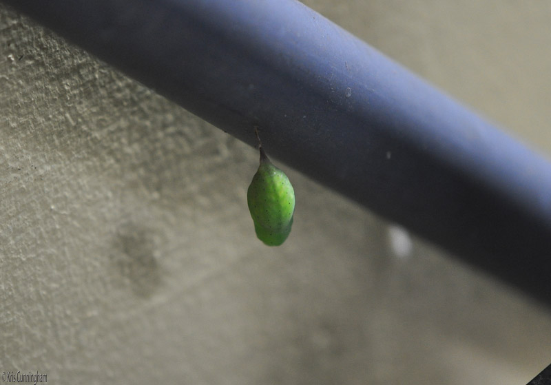 I was organizing the shelves by my table yesterday, and noticed this little cocoon hanging from the pipe that handles the water from the AC
