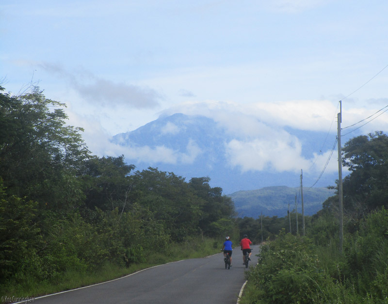 My friends bike ahead of me with Volcan Baru towering in front of them