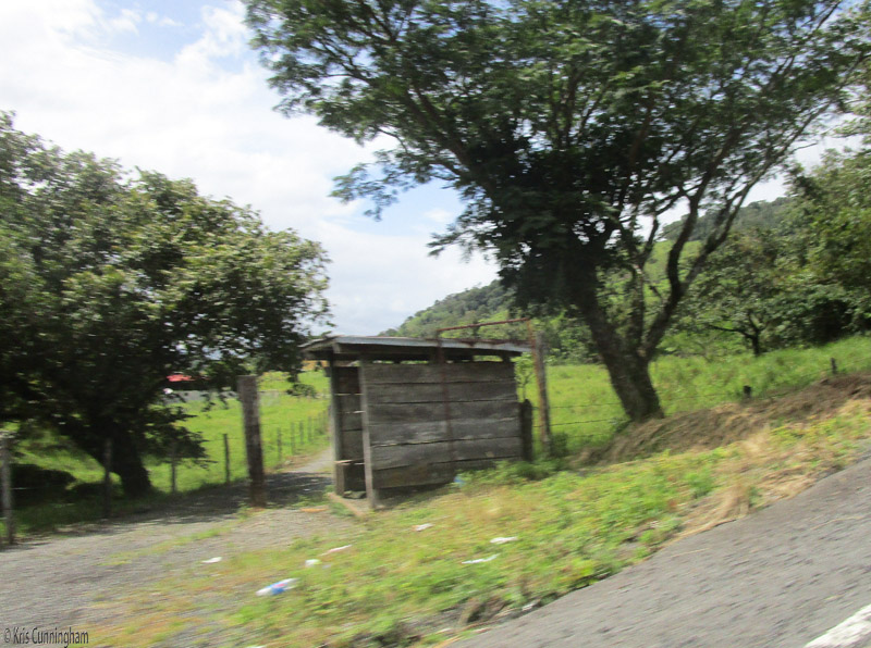 Cute wooden bus stop, and we are encouraged to see any bus stop and a few more houses
