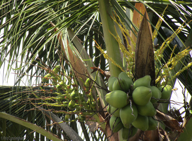 One a coconut gets going, it seems to produce continuously. This one has young green coconuts, small ones to the left, and flowers above just starting to form into little coconuts.