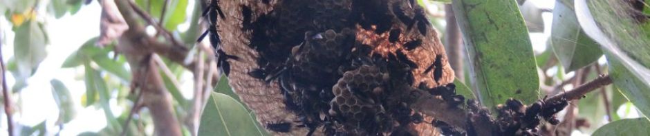 We also have more varieties of insects than in the whole of North America. I’ve never seen so many kinds of bees and wasps. I noticed a bunch of little ones on a small branch of our guanabana (soursop) tree last Monday. By Tuesday I could see the definite beginnings of a hive, so I snapped a photo every day to see their progress. I’ve seen many of these hives on houses and in trees and some say they are good luck. They are like the most delicate paper and very lightweight.