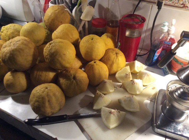 Right now it’s lemon season, those crazy big lemons I have written about before. The first tree was severely trimmed last year but we have gotten a few. Yesterday we checked the other tree and it had a lot waiting to be picked up.