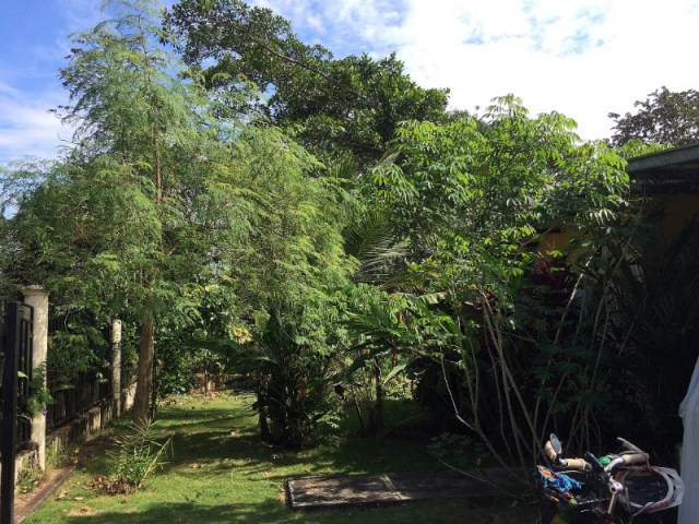 The yard was mostly weeds when we arrived but now it has a lot of things growing. That’s moringa on the left, and a small patch of ginger in front. Behind is a lemon tree, the really big ones. I started it from seed and maybe next year it will be big enough to fruit. Behind are a couple avocados near the fence. In the middle is a lipstick palm, some plantains, and behind that a dwarf coconut palm, pineapples, and a plant that’s good for making tea. On the right, the tall things are yucca. There are more pineapples below, and some heliconias behind. Farther back are a couple young cashew apple trees.