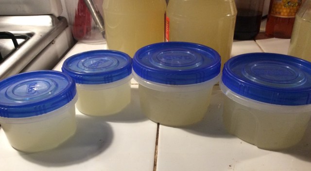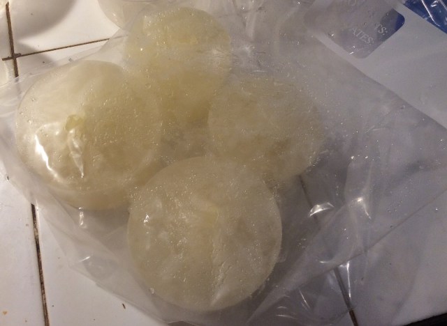 Frozen lemon juice “cubes” in the bag, ready for the freezer. The containers were refilled for the next batch of “cubes”.