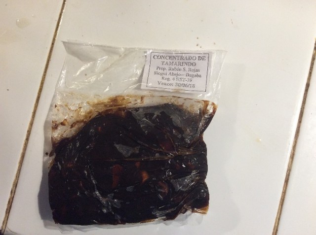 I buy my tamarindo like this from the produce market down the street. I have finally discovered a tree nearby but need to wait for fruiting season. It makes pods of seeds and fruit that need to be boiled, and then you would get something like this already prepared fruit in the bag. To make the drink, put the fruit in water and squish it around with your fingers to loosen the fruit pulp from the seeds. Then, strain out the seeds, add water and sweeten to taste. This package is good for a 2 liter pitcher of drink.