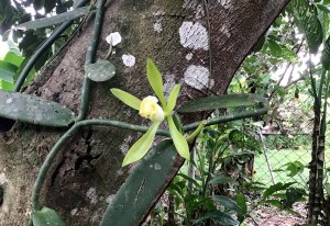 Last but definitely not least, I was running around with my neighbor one day. It is common to throw yard trash in the nearest vacant lot, so we were exploring the yard trash and came home with some plants. A kind reader identified this one as a vanilla orchid. It’s been climbing up the guanábana tree for quite a while, maybe 3-4 years. I was eating breakfast this morning and happened to glance over and saw this! A flower! I’m not going to hold my breath that it will make a vanilla bean, but you never know. Whatever it does, I’m happy to see the flower.