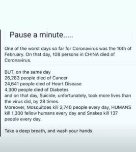 not to mention drug overdoses, gun violence, traffic accidents, poverty, lack of health care….. the list goes on and on. You get the idea. Do everything you can to be sensible and protect yourself, but do not expect the world to be a safe place. “The future’s uncertain and the end is always near” (Roadhouse Blues, the Doors). Every day is a gift. Appreciate it, stay calm, and wash your hands.