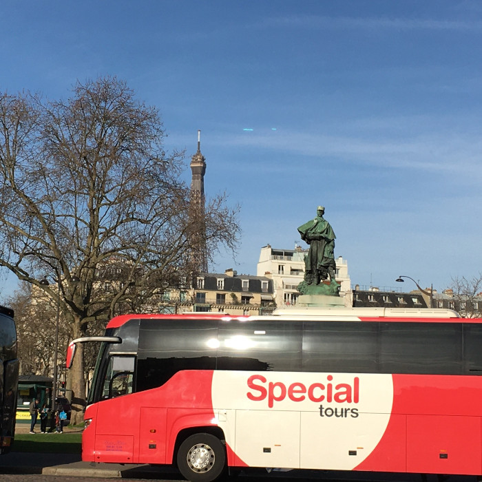 Our tour bus, the daytime home away from home. You can see the Eiffel Tower in the background