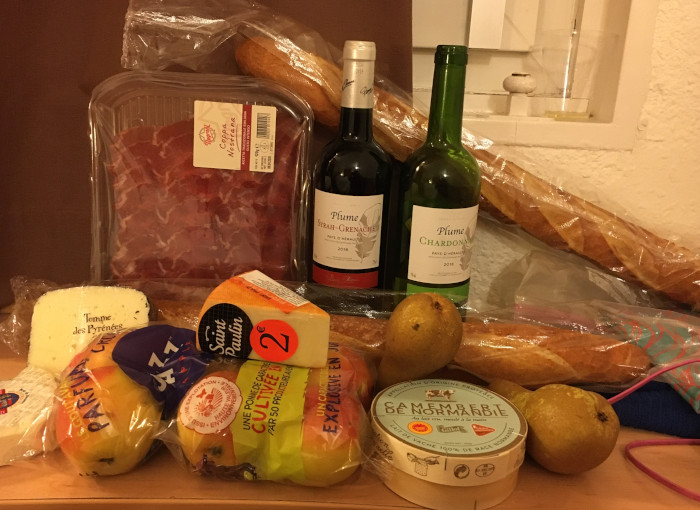 Our purchases, 4 kinds of cheese, 4 apples, 2 pears, 2 baguettes, 2 bottles of wine, and some delicious smoked ham product, total about 32 euros.