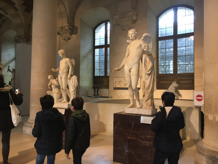 On the right, Eros, known as the Borghese Genius, a Roman copy of a Greek statue from the 4th century BC. On the left, Eros and Psyche