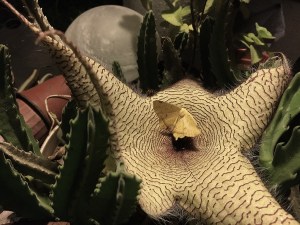 I have this cool plant that makes stinky flowers. (https://en.wikipedia.org/wiki/Stapelia_gigantea) It attracts flies for pollination instead of bees. One night it had attracted this pretty little moth. It was actually more white but the light at night gave everything a yellow glow.
