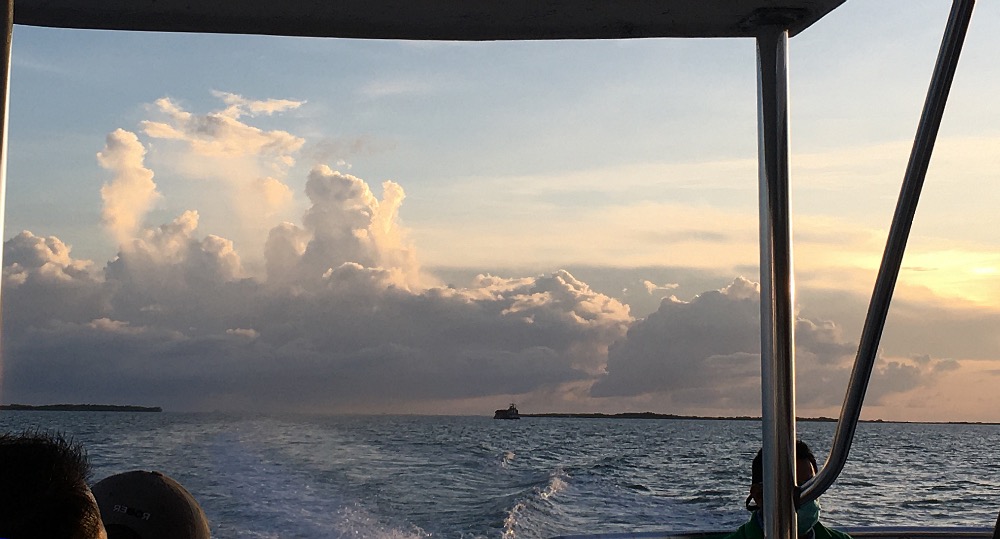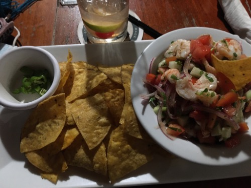We made it to the hotel and found it’s a very nice one! They even scattered flowers on the bed and in the bathroom. There is a restaurant on site that looks out on to the water. I had shrimp ceviche and a fancy rum drink (hey, when in Belize…) The last photo doesn’t do the scene any justice at all, but the full moon shining through the coconut palms and on to the water was gorgeous. The evening was warm and balmy with a light breeze, and you really felt like you were in a paradise resort.