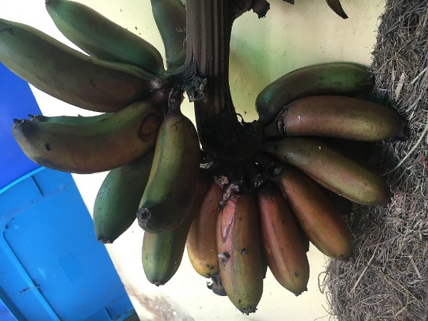 Unfortunately for the squirrel, we realized the bananas were ready to cut down. Here are some waiting to ripen. They are smaller, red on the outside, and firm and sweet on the inside. Yummy!