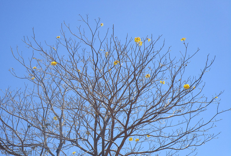 the yellow one in our neighborhood is done for the year. On windy days the flowers can be blown off in a day or two.