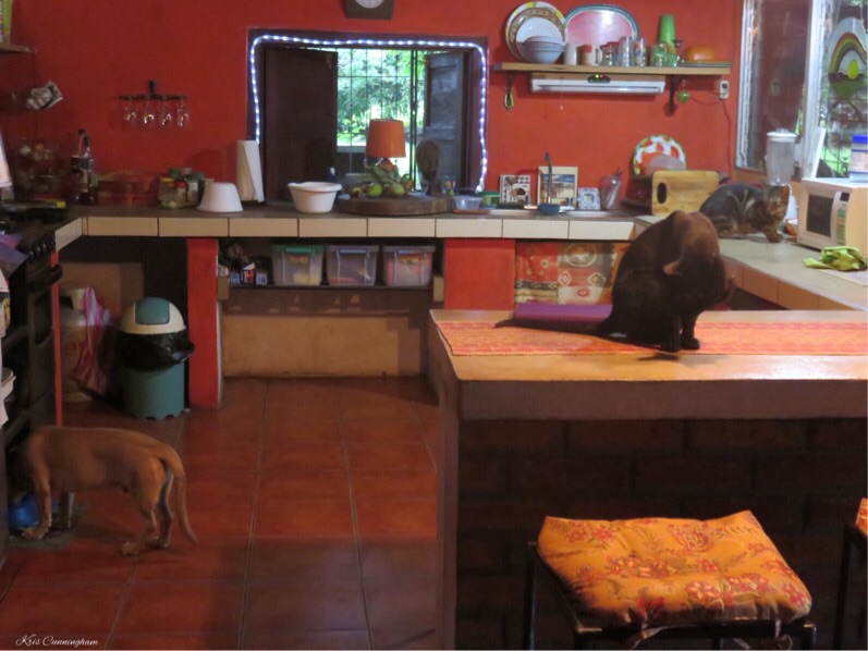 And another day begins! Everyone is in the kitchen at once which is unusual, especially for Ocho. (Look closely and you’ll see the third cat heading out the window)