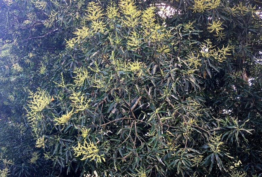 My favorite mango tree has lots of flowers, which means there should be lots of fruit free for picking up later on.