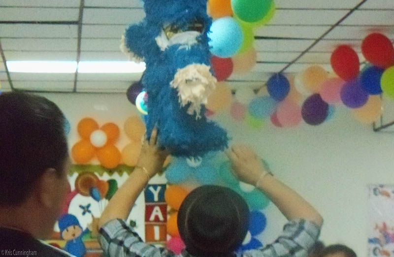 After a few more whacks the arm is so damaged that the piñata is considered vanquished, and the adults help release the candy.
