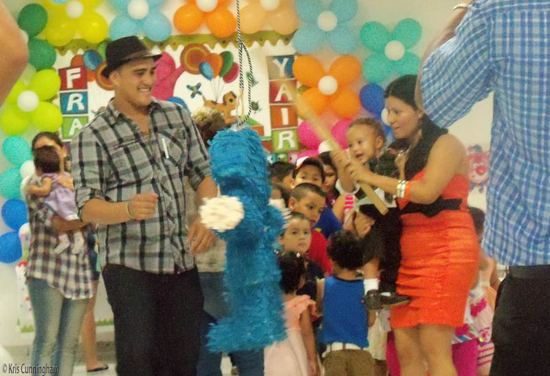 The birthday boy takes the first whack at the piñata, with his mom helping and dad standing by.