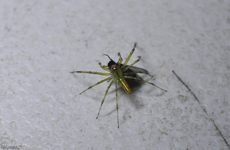 Flies are fast and I can’t get them without a fly swatter. But, the spider disappeared down the side of the table and returned shortly with a fly in its grasp!