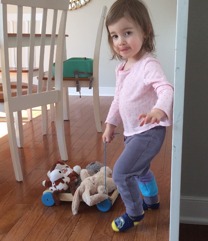 The stuffed animals get a ride around the house