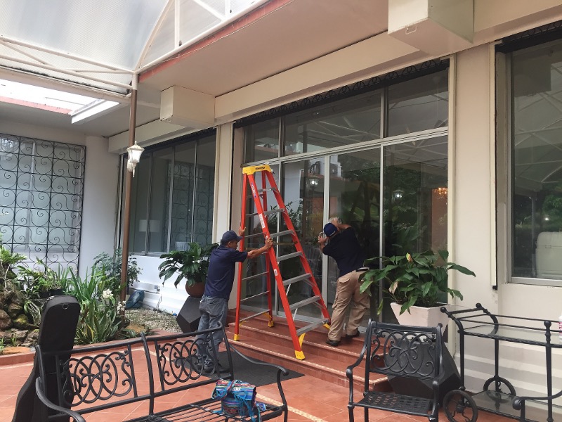 Guys washing windows. The tables and floor were also washed while we were there, and all the chair cushions were still stacked inside.