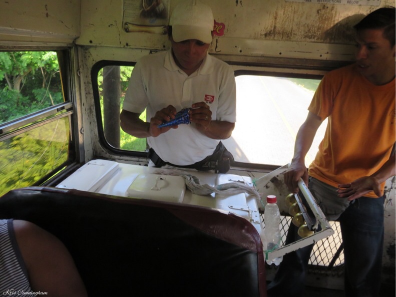 The guys with the ice cream cart wanted to take the bus, so they just loaded the cart into the bus. They even made a couple sales in the process.