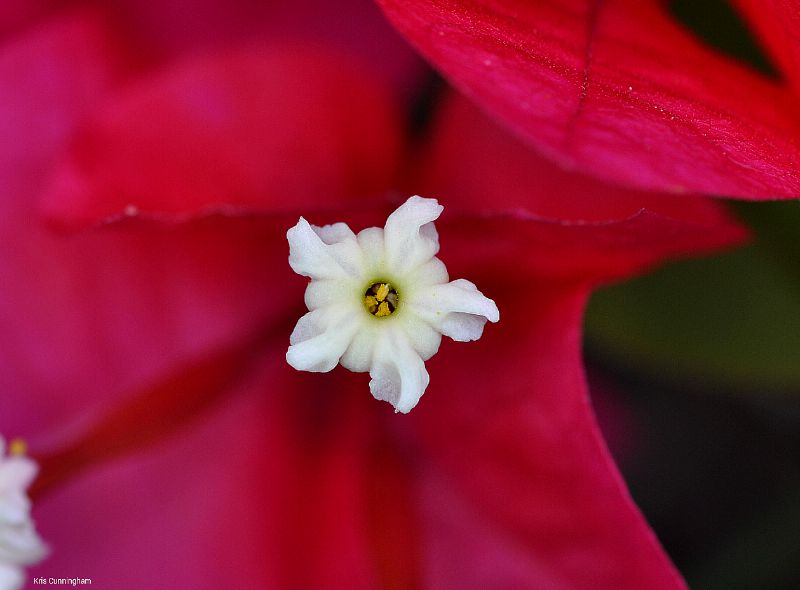 Bougainvillea has these tiny white flowers in the blossoms