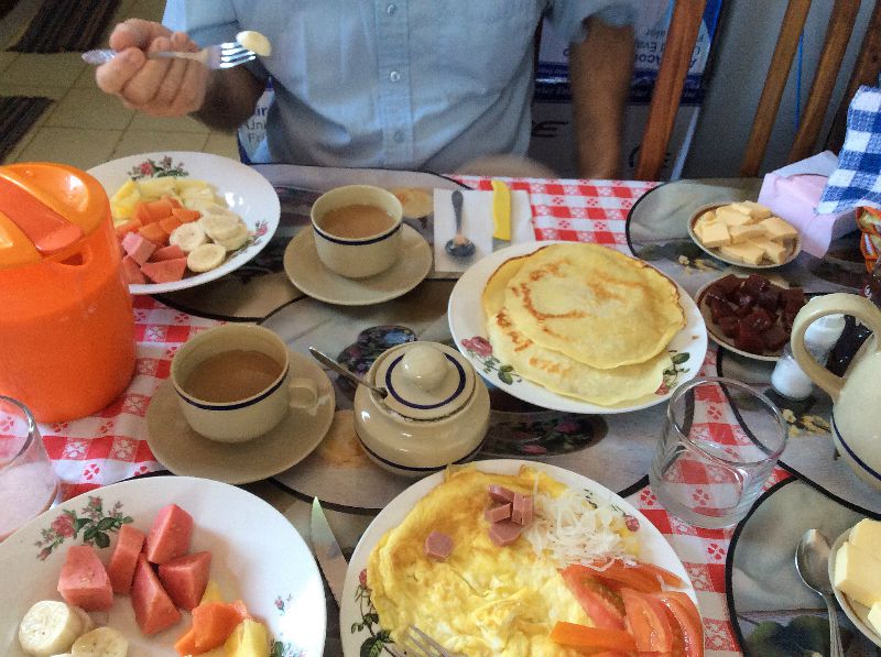 Check out this breakfast! There’s a basket of really good rolls to the side too, and the thermos off coffee and pitcher of milk, and a pitcher of fresh made juice. It was like this every morning.