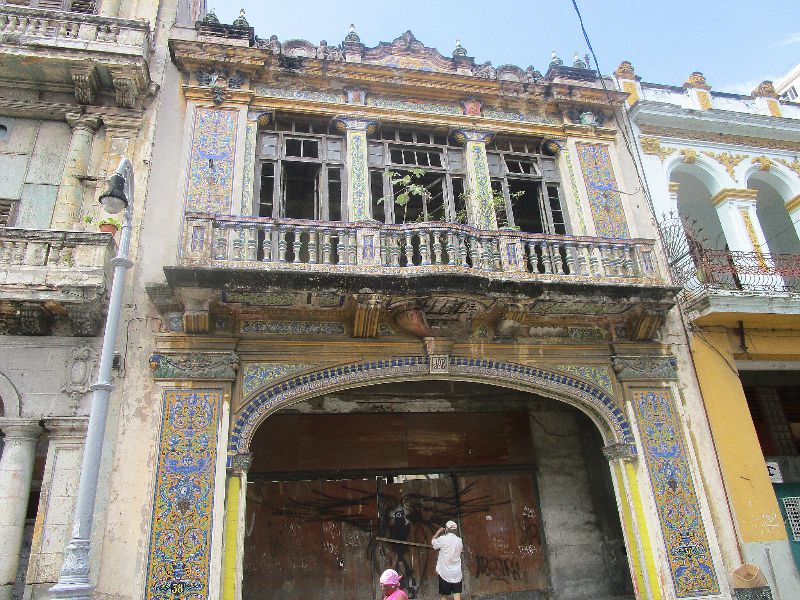 I backed off to get a look at the whole building with the ornate tile while Joel enjoyed the street art. Apparently the building is not in use, judging by the trees growing in the second floor.