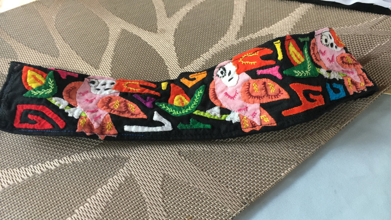 The young lady in jeans and a black shirt is a bilingual US/Panamanian who was there to help with translation and anything else as needed. The teachers were two lovely Guna women. You can see them in their traditional dress in the photos, with the molas worn in the traditional way as part of their clothing on the upper body. The other photo is a hat band I bought for a gift. Along with the traditional molas, they make other useful items that people can buy.